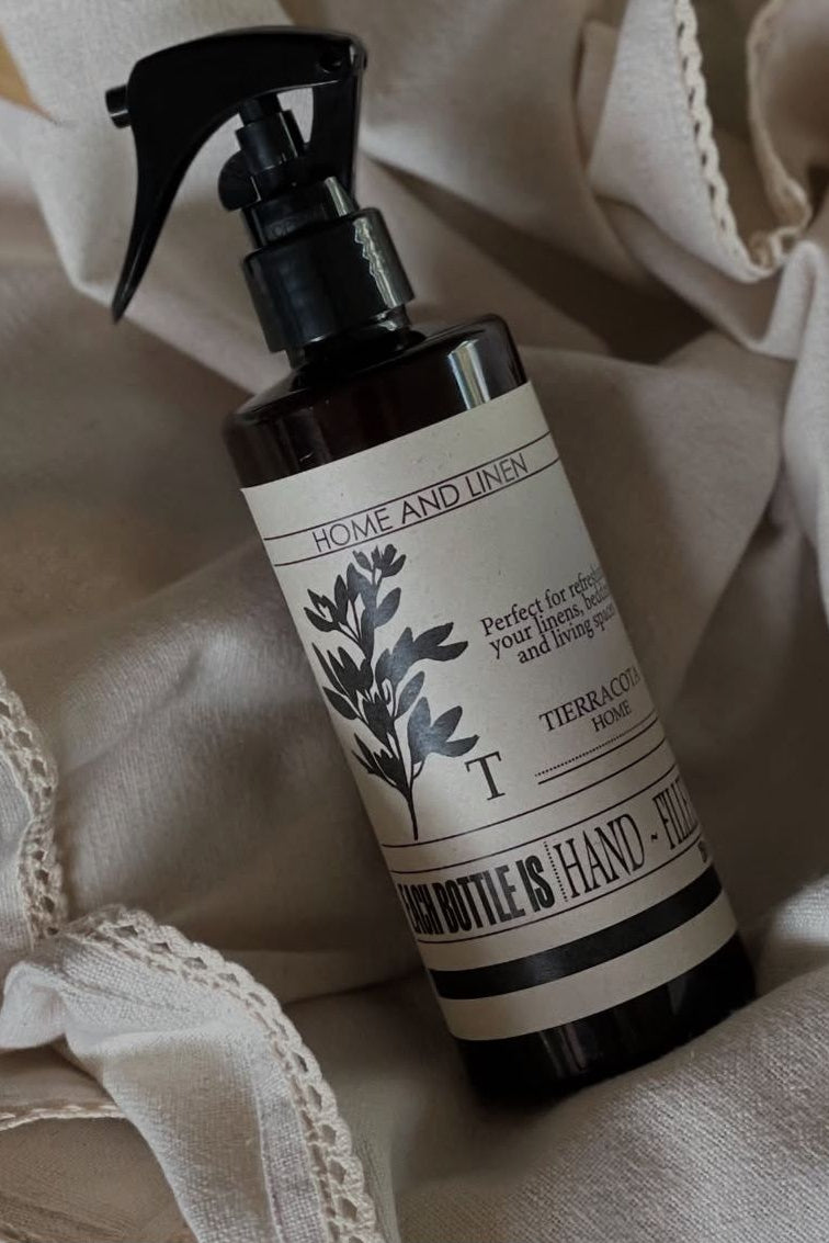 Refresca tus textiles y espacios con una fragancia natural y envolvente. Elaborado a mano y presentado en botella ámbar, el Home & Linen Mist de Tierracota Home perfuma cortinas, ropa de cama y ambientes con un aroma sutil que transmite calma y bienestar.