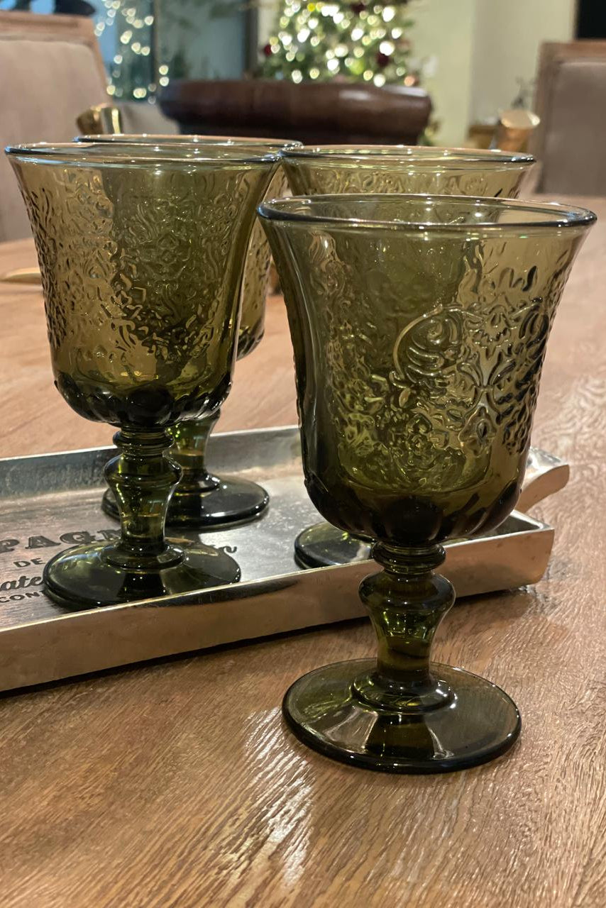 Elegantes y llenas de personalidad, estas copas en vidrio verde con relieve aportan un toque clásico y sofisticado a cualquier mesa. Su diseño inspirado en el estilo vintage resalta por sus detalles texturizados y su forma delicada, perfecta para elevar la presentación de vinos, agua o cocteles.