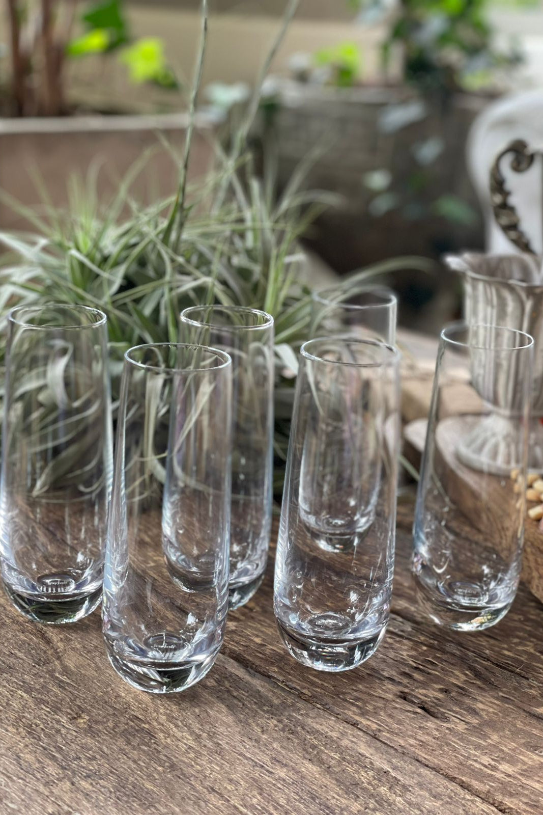Diseño minimalista, transparencia impecable y un brillo que realza cualquier mesa. Estas copas de vidrio alto destacan por su forma esbelta y base sólida, ideales para servir espumosos, cócteles o jugos con estilo y distinción.