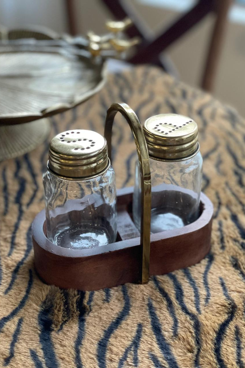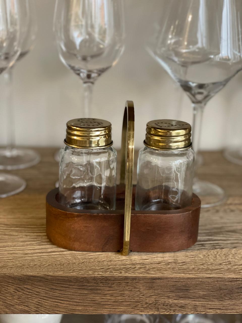 Este encantador set de salero y pimentero combina materiales nobles y diseño artesanal. Las botellas de vidrio con tapas metálicas doradas descansan sobre una base de madera con asa central, que facilita su transporte y le aporta un aire rústico y elegante a la mesa.