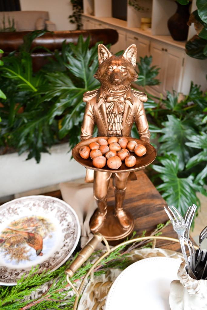 Transforma tu mesa en un espacio lleno de estilo con esta figura decorativa en forma de zorro vestido con un traje clásico. Con un acabado metálico en tono bronce, sostiene una bandeja ideal para poner frutos secos, dulces, llaves u otros pequeños objetos.